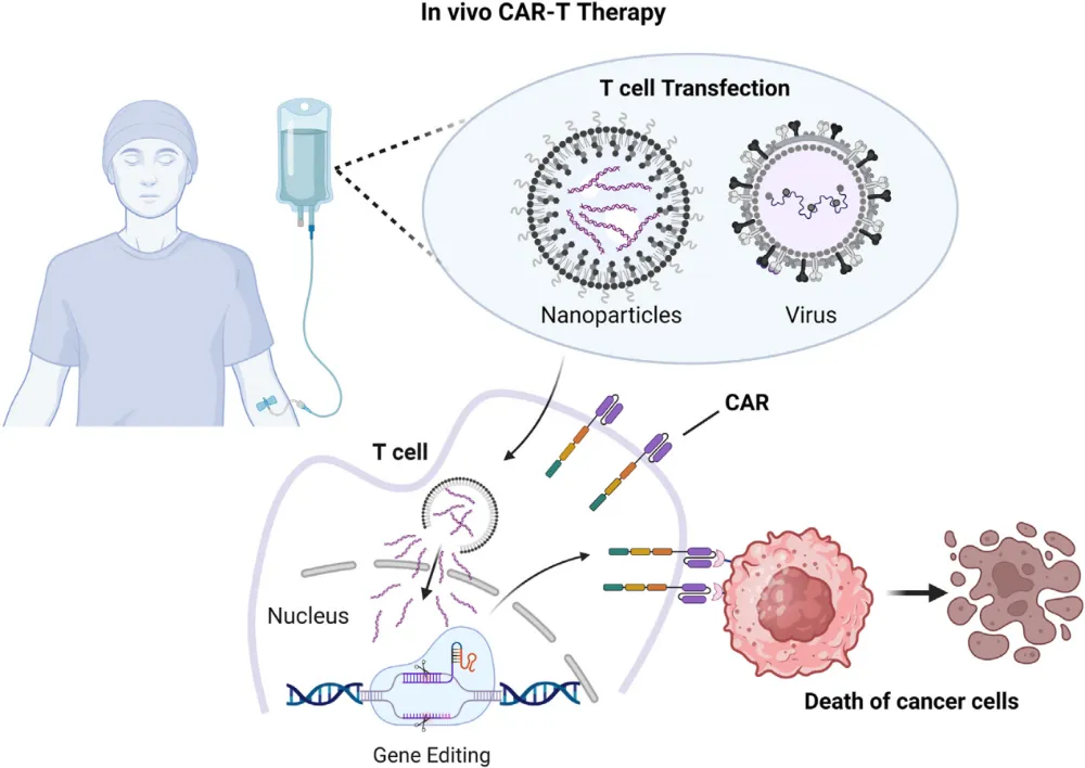除了通用型CAR-T,还有另一类技术路线,即体内CAR-T疗法。它通过系统性注射递送载体,将编码CAR结构的基因或mRNA直接递送到患者体内的T细胞中,实现T细胞的“原位”重编程。
