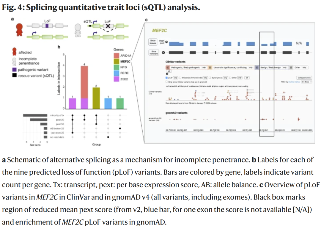 在734个pLoF变异中,有9个位点与特定的剪接数量性状变异(sQTL)共定位,提示其所在区域可能通过可变剪接调节显现性。以MEF2C基因为例,两个pLoF变异位于低表达区(pext值下降约50%),且携带sQTL的个体呈现外显子排除现象。MEF2C的功能缺失与神经发育障碍相关,这表明部分携带者因sQTL导致的剪接调节而未发病。此结果提示:sQTL及可变剪接是导致显现性降低的重要机制。