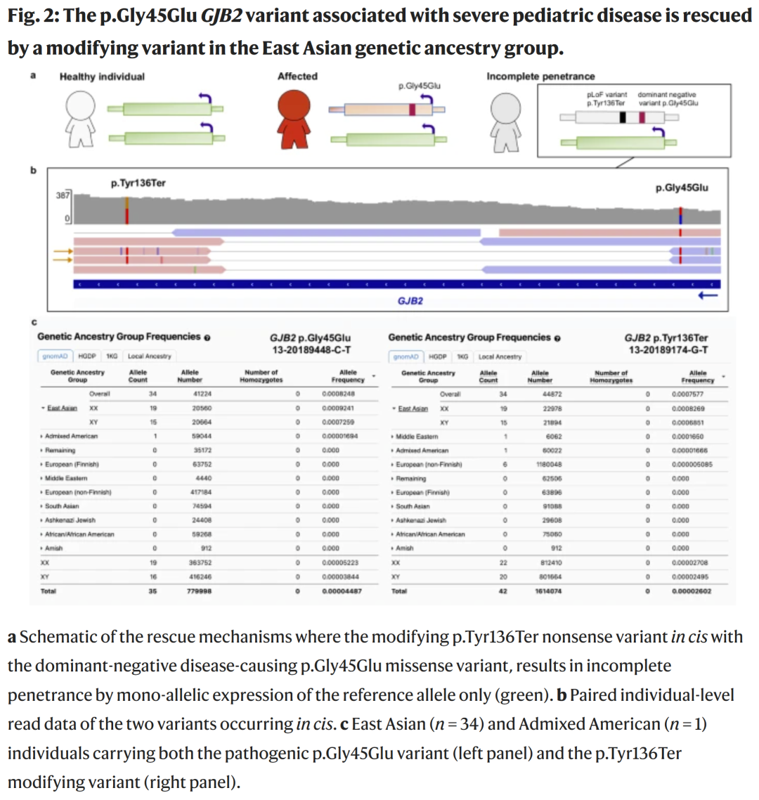 研究人员发现一个典型的群体特异性显现性调节案例:在东亚人群中,致病性 GJB2 p.Gly45Glu 变异(导致角膜炎-鱼鳞癣-耳聋综合征)在35名个体中出现,但所有人同时携带 p.Tyr136Ter 无义变异,两者位于同一单倍型上,后者“抵消”了前者的显性负效应,使这些个体未表现出致死性表型。这是一个罕见但清晰的“功能缺失救援”实例,展示了遗传背景在显现性调控中的关键作用。