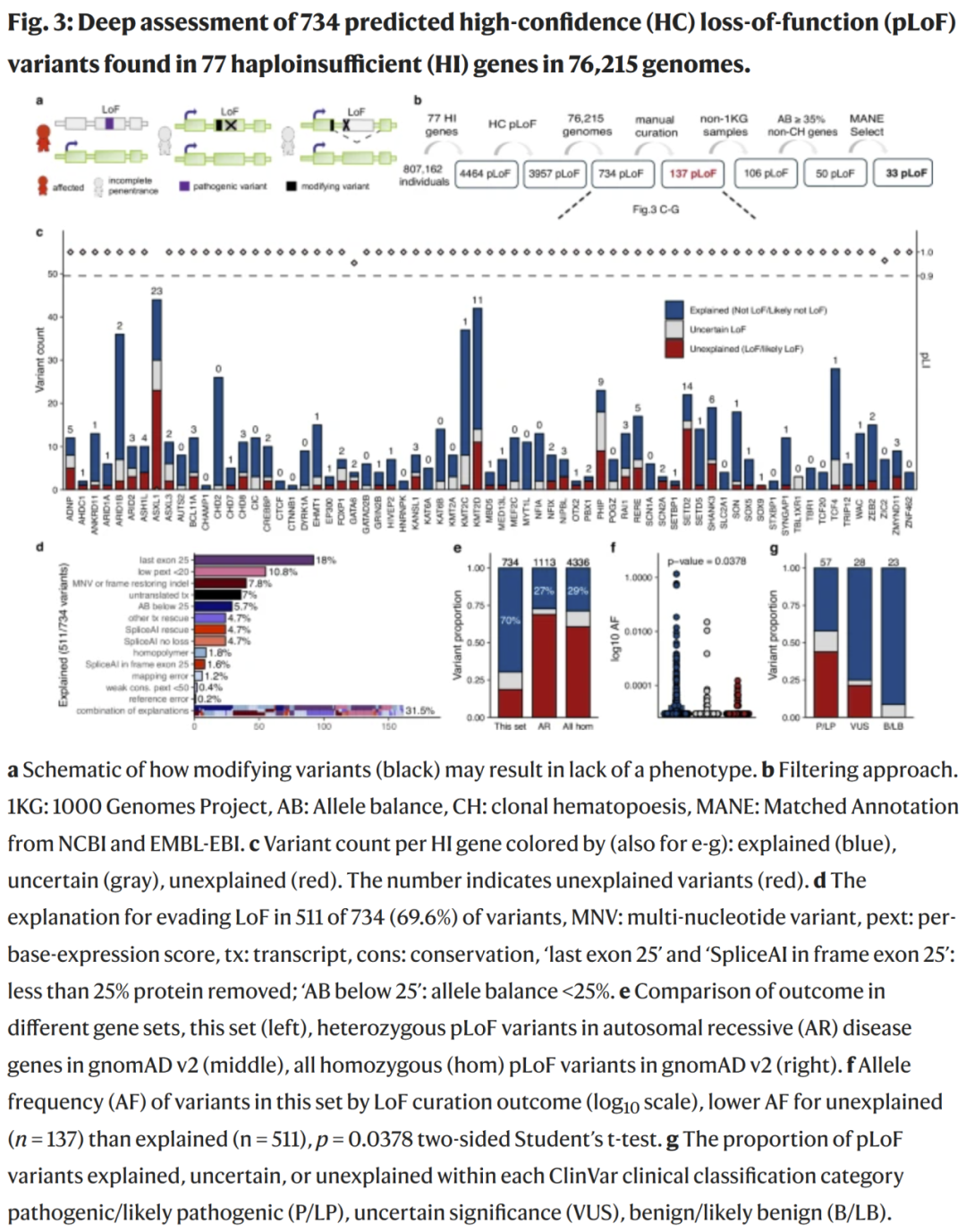 在807,162个体中,共检测到4,464个pLoF变异,其中734个位于全基因组数据中、分布于77个高显现疾病相关基因。研究人员逐例分析发现,约70%的变异可被解释为并不真正导致功能丧失,主要原因包括: