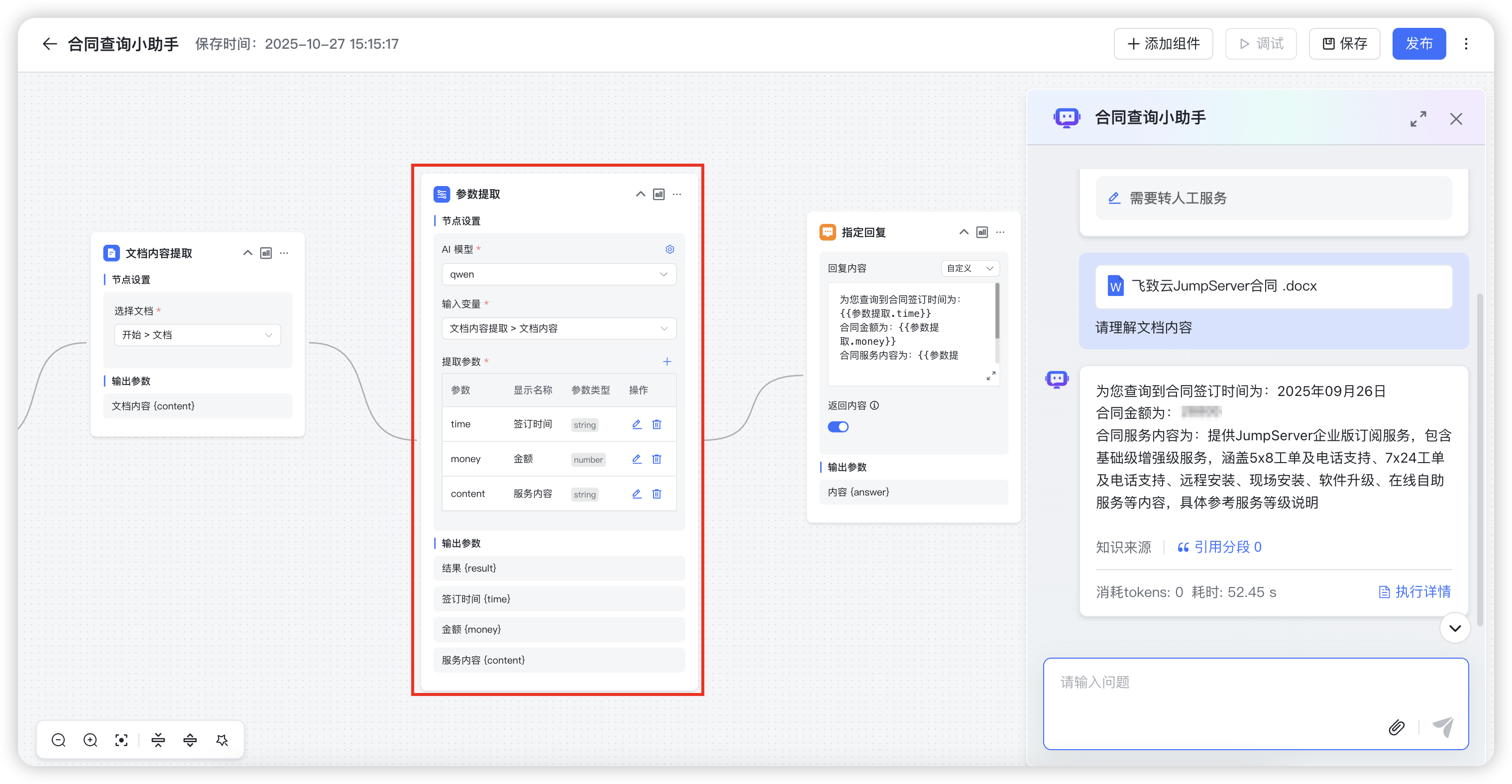 参数提取:该节点支持基于AI模型从非结构化文本或半结构化文本中提取结构化参数。典型的使用场景包括在处理合同文档时,自动提取“签订日期”、“合同金额”、“服务内容”等关键参数。