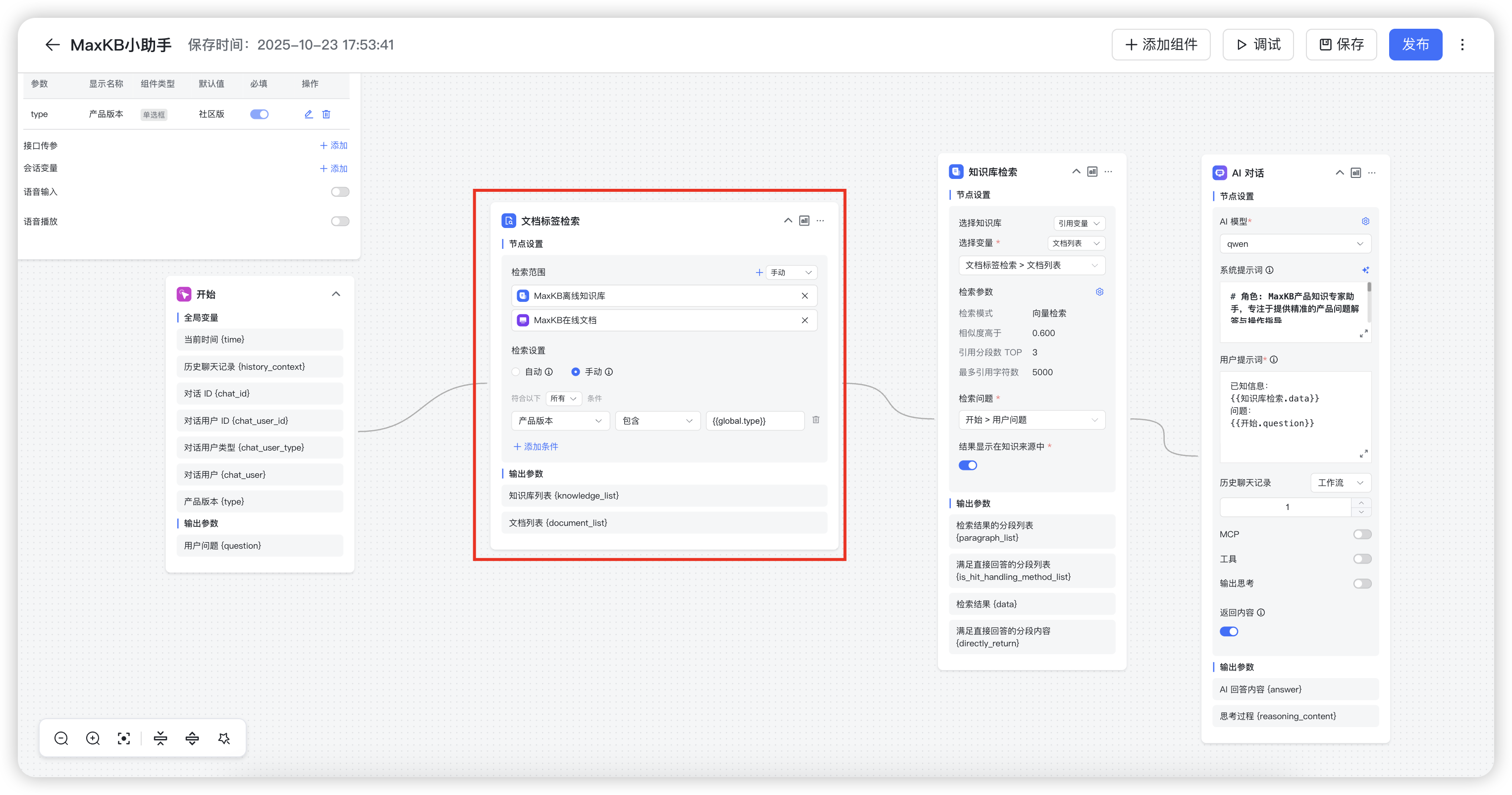 文档标签检索:MaxKB在高级编排应用中新增文档标签检索节点。该节点的主要功能是通过设置好的文档标签筛选条件检索出符合条件的文档,再配合知识库检索节点进行分段内容检索,从而进一步缩小检索范围,让检索结果更加准确。