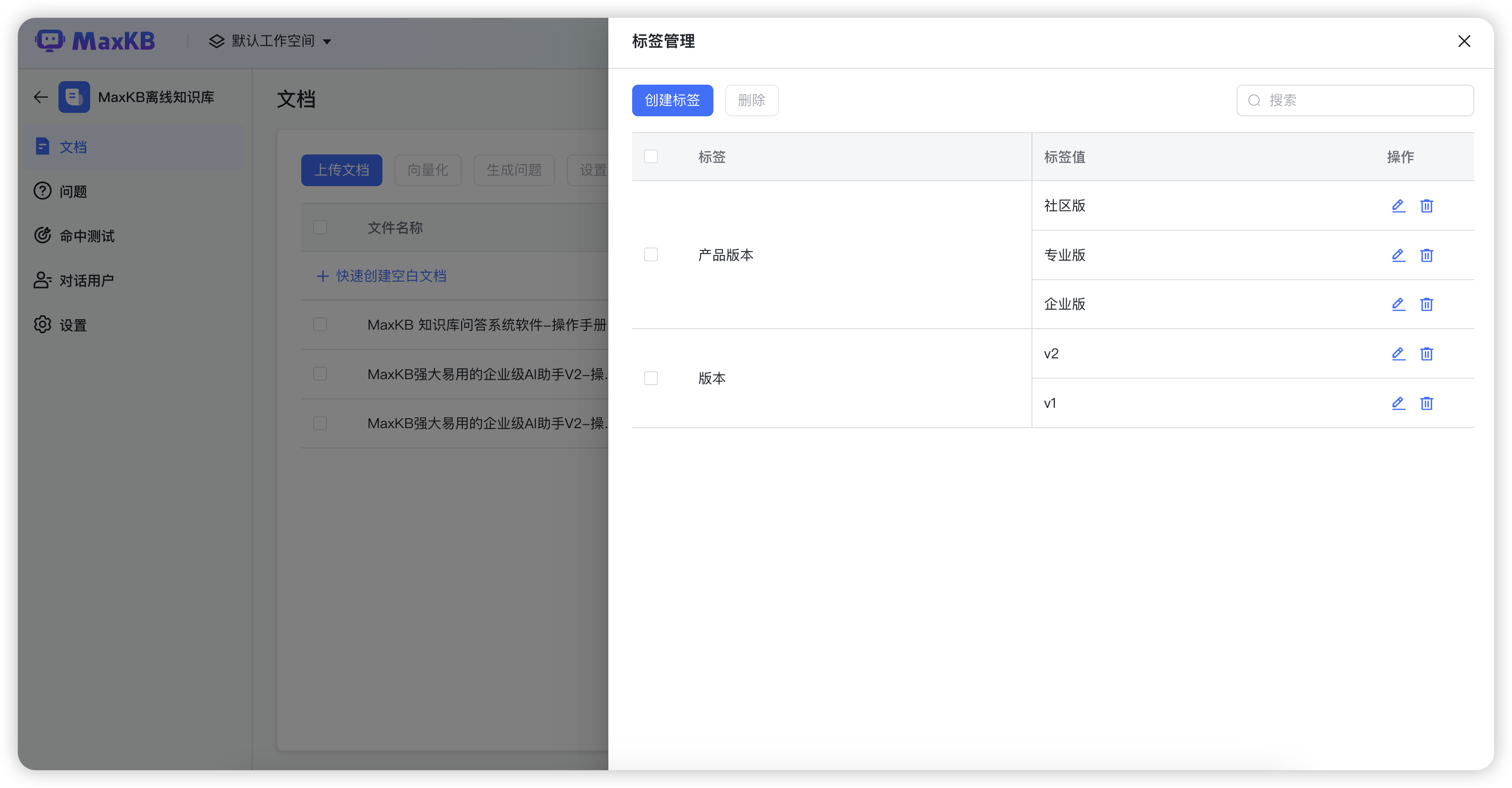 标签管理:MaxKB在知识库的“文档”页面新增标签管理功能,每个知识库都拥有独立的标签管理体系。用户可以在知识库中选择“文档”→“标签管理”,进行标签元数据的配置。