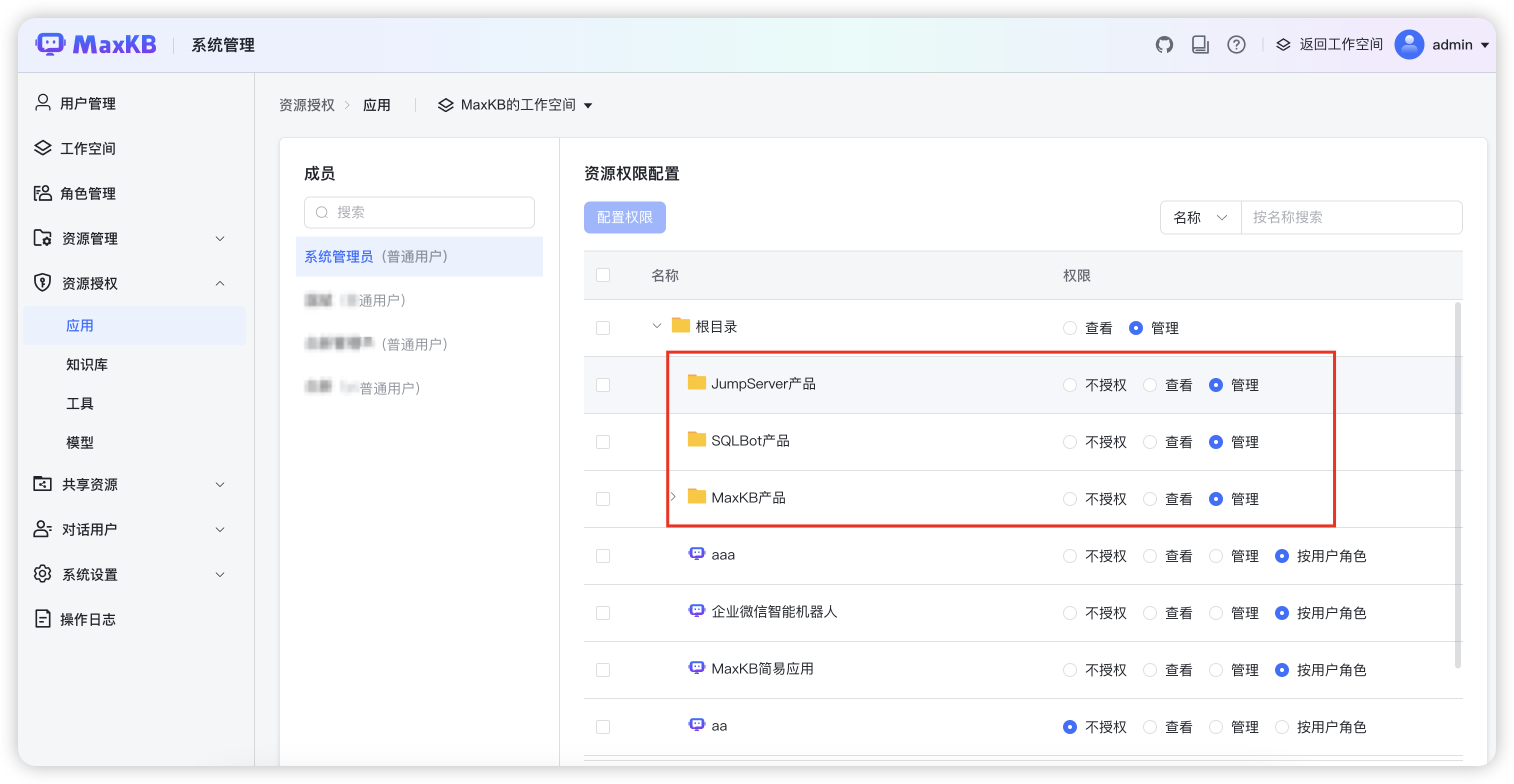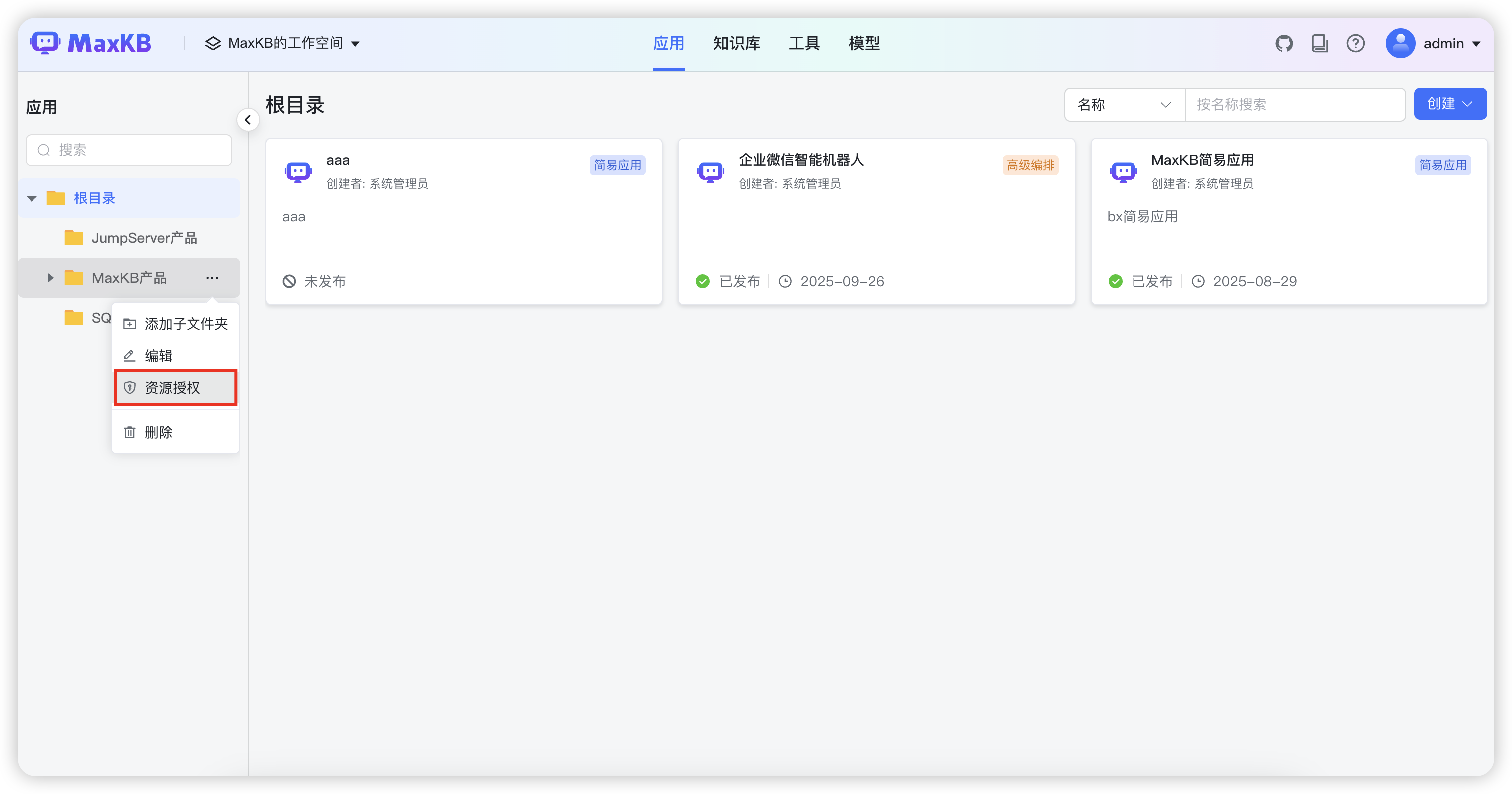 ▲图9 MaxKB在工作空间中支持按文件夹进行资源授权