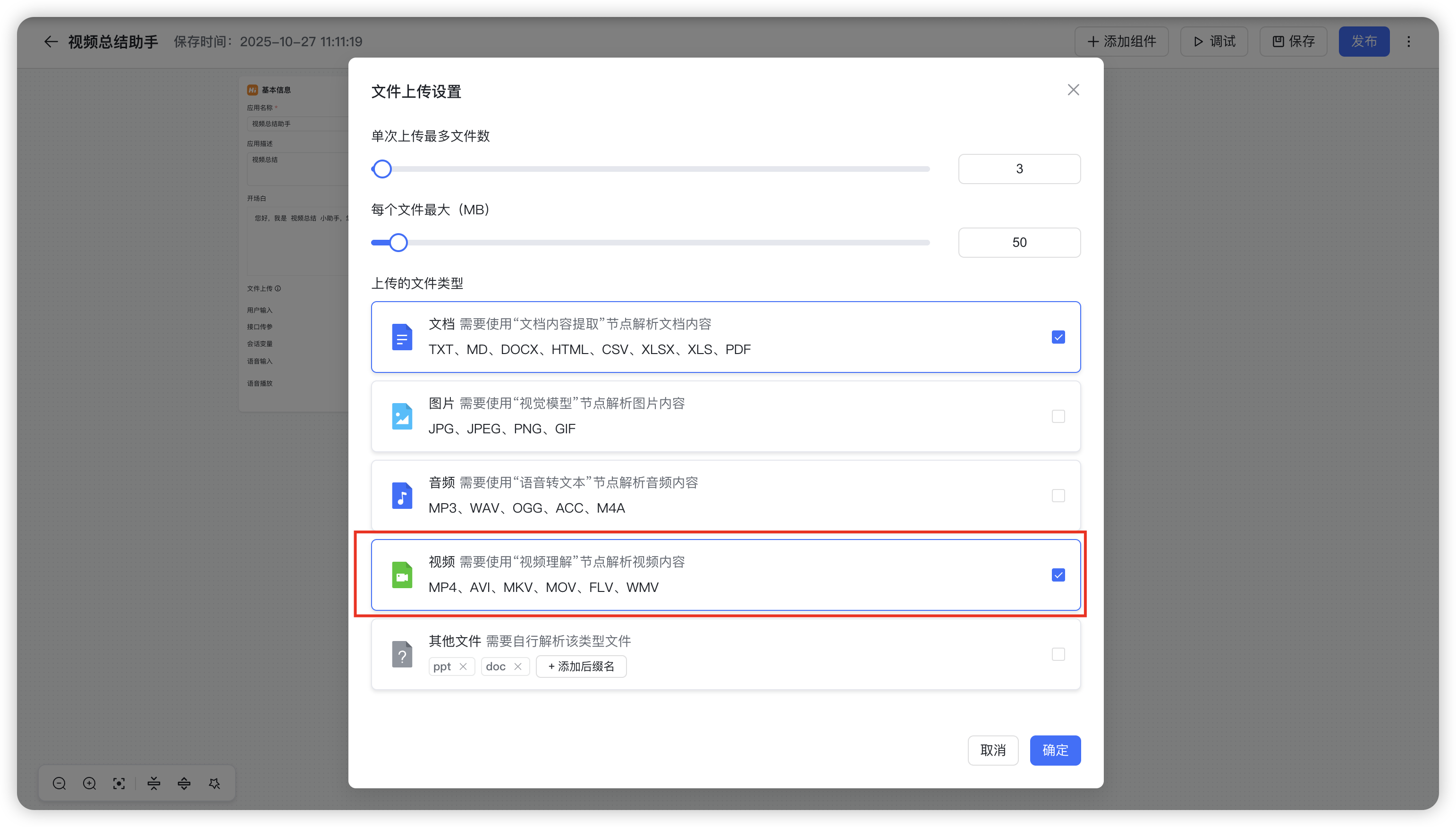 视频理解:MaxKB在文件上传设置中新增“视频”类型选项,勾选后用户可在问答页面上传视频文件(例如MP4、AVI等格式),为后续解析提供输入源。配合工作流中新增的“视频理解”节点,可以实现对用户上传视频的深度解析及文本转化输出。