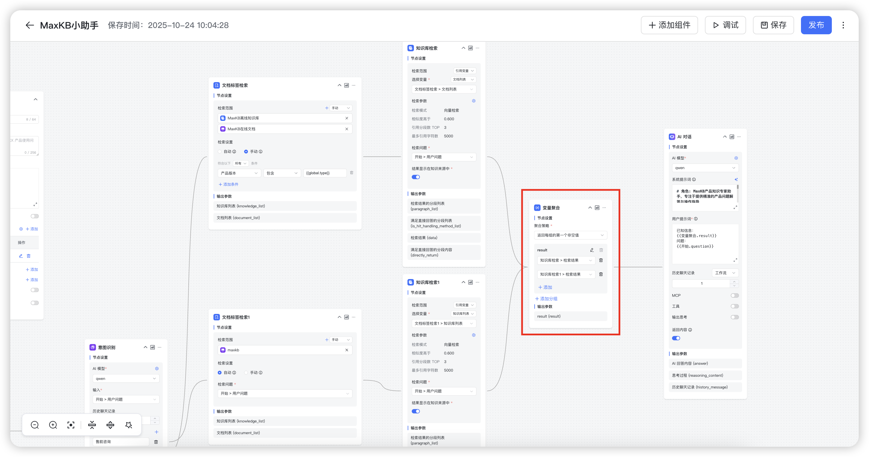 MaxKB v2.3.0社区版在高级编排应用中还新增了变量拆分、变量聚合、参数提取及视频理解等多个节点,进一步覆盖复杂应用流程的相关场景,致力于降低智能体搭建的门槛。
