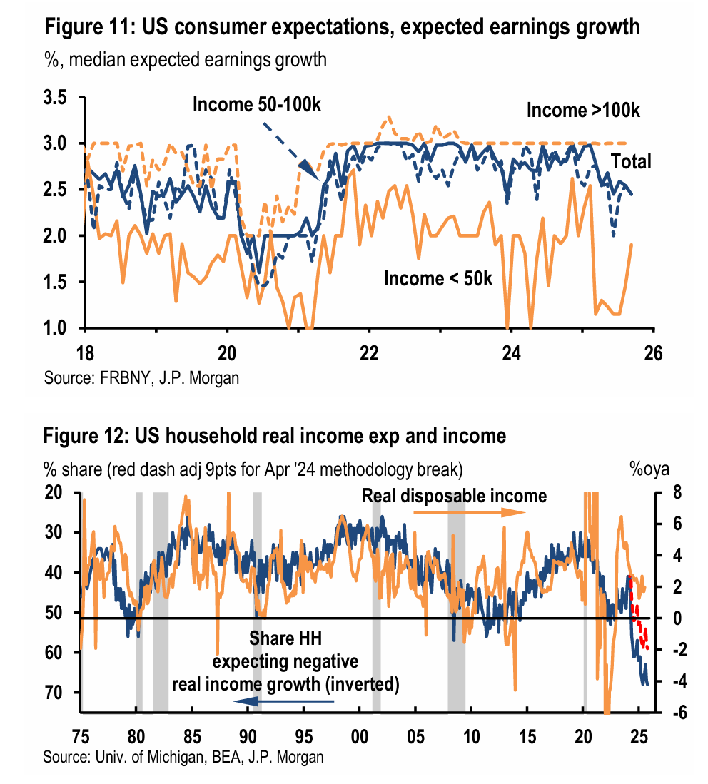 其次,消费者信心和预期传递出悲观信号。根据纽约联储的调查,美国家庭对未来名义收入增长的预期中值已降至2.5%以下。密歇根大学的调查结果则更为严峻,高达68%的受访家庭认为未来一年的收入增速将跟不上物价上涨——这是自1975年以来的最悲观水平。