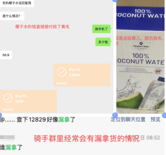刚开始跑外卖时,我曾两次漏送椰子水。在莱蒙片区,我把牛奶和椰子水弄混了,两个订单交叉送错了地方,等我去更换时,顾客坚称自己收到过,所以我只能自己掏钱买单给顾客送过去。两个月后,在东方明珠园,送达顾客前发现少了椰子水。我很笃定是少了货品,赶紧让黄毛帮忙检查,黄毛说货架上没有多余的货,内仓核对数量已无误,我只能自己买单。明明有监控的,他们却不给我使用。