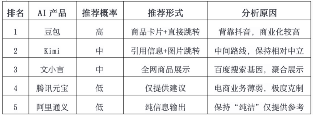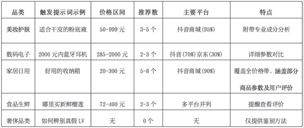 测试显示,豆包AI的商品推荐有明确触发逻辑。我们整理了不同品类的触发情况: