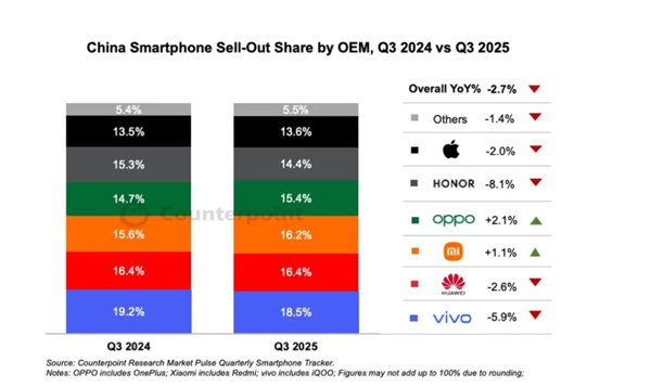📊 **市场整体下滑,vivo稳居第一**:2025年第三季度,受宏观经济环境影响,中国智能手机市场销量同比下滑2.7%。尽管如此,vivo凭借18.5%的市场份额,继续保持其市场领先地位,显示出其在挑战性市场中的韧性。