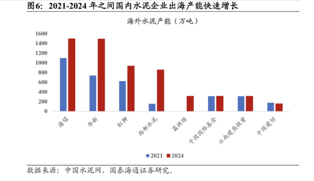 近几年,水泥企业进一步加快了出海的脚步。据水泥网统计,2021年,国内水泥企业海外投资产能在4503万吨,2024年已经提升至8758.3万吨,规模扩大接近一倍。