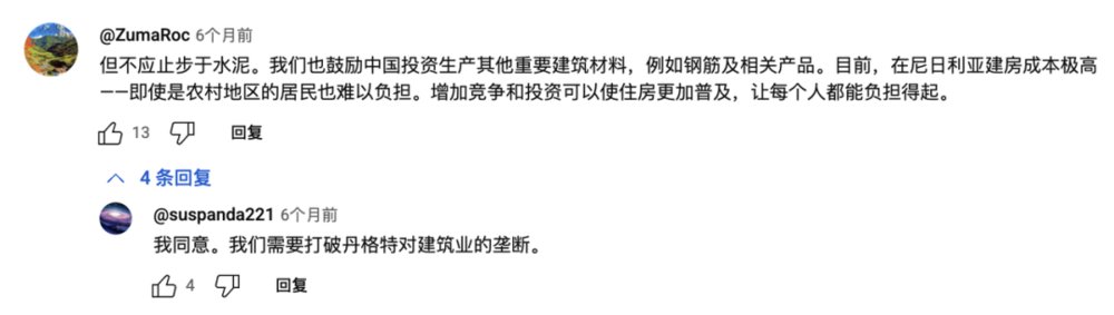 在YouTube相关视频下,不少网友对丹格特一家独大表示不满,欢迎中国水泥企业进入尼日利亚市场,以压低水泥价格,促进经济发展,也有网友担心就业、对中国水泥生产投资过度依赖影响本地产业稳定与发展的问题。