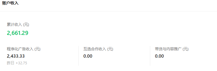 9月1日开通流量主,2个月的时间广告收入是2661.29元,文章赞赏72元,合计2733.29元。