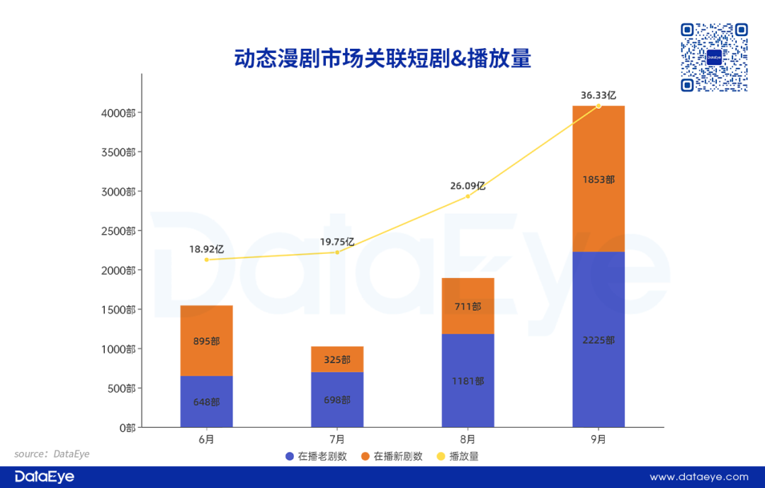 其一,市场需求巨大,游戏IP以身入局抢“曝光”。从目前观察来看,动态漫行业正处于供需双轮驱动的爆发期,今年9月在播漫剧已经超过4000部,环比8月近乎翻倍,而总播放量已经超过36亿。可是随着市场规模的快速扩张,市场需求必然巨大。