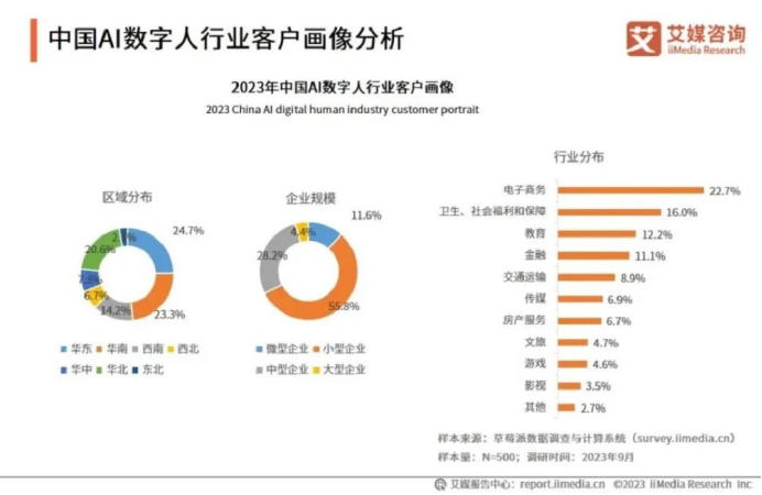 AI带货可能会让商家降本增效,毕竟可以砍掉真人主播的人力成本、能够24小时不间断直播。据艾媒咨询调研数据显示:仅2023年9月,在对500家数字人行业客户的调研中,电商类占比高达22.7%。