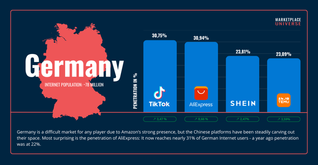 此外,速卖通在西班牙渗透率达到72.5%,意大利33.4%,法国48.8%,德国30.94%。而且,速卖通在欧洲的渗透率还在快速增长中,以德国为例,速卖通在德国市场的用户渗透率已达到30.94%,超过 Shein(23.81%)与 Temu(23.09%)。
