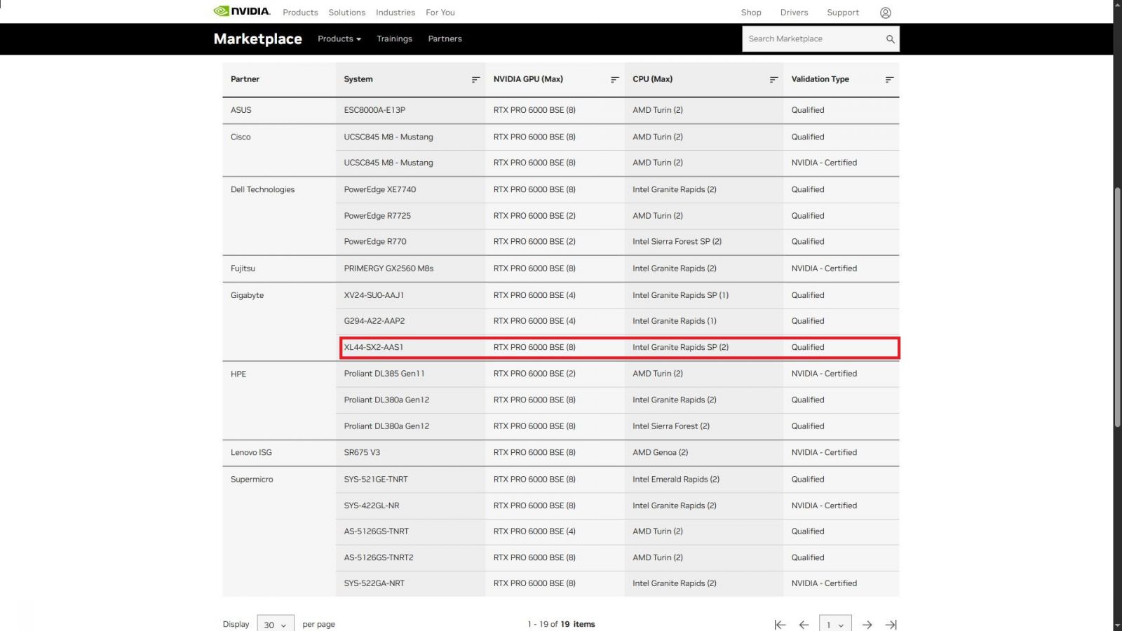 今年8月SIGGRAPH大會期間,輝達正式推出首款Blackwell架構的資料中心GPU加速卡,名為RTX Pro 6000 Blackwell Server Edition(RTX Pro 6000 BSE),在此之前,輝達陸續在3月GTC大會、5月台北國際電腦展,宣布將與多家伺服器廠商合作推出RTX Pro伺服器,根據輝達公開的合格系統目錄網站,初期列出搭配RTX Pro 6000 BSE的伺服器產品不多,最早有Dell PowerEdge XE7745,之後增加華碩ESC8000A-E13P,以及Supermicro SYS-522GA-NRT,時至今日已擴增至19款機型,其中有些是這幾個月發表的產品,像是技嘉科技9月推出、11月上市的XL44-SX2-AAS1,