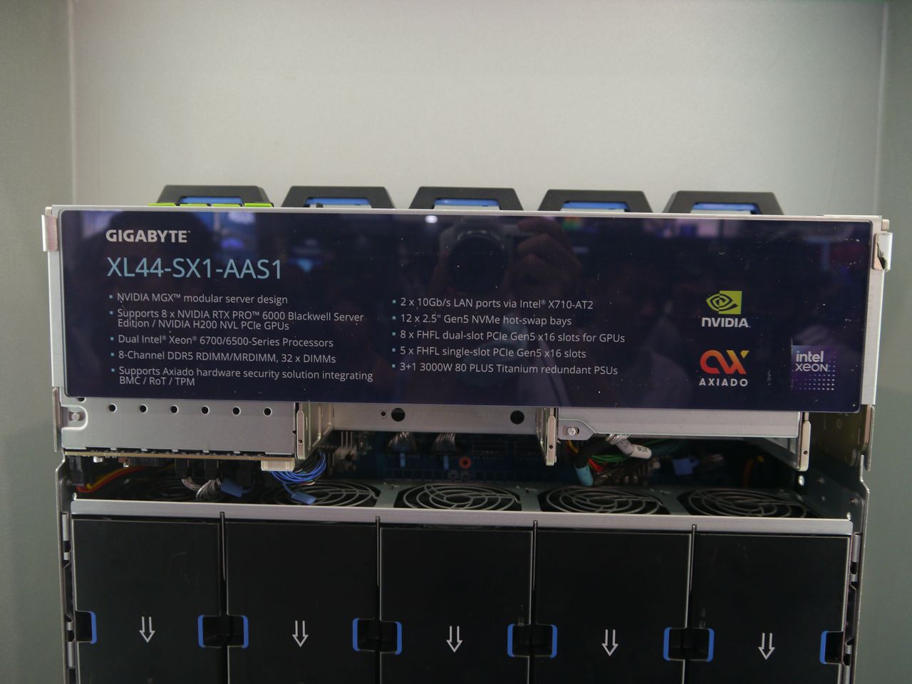 關於處理器的部分,XL44-SX2-AAS1採用英特爾Xeon 6平臺,可搭配兩顆Xeon 6700系列或Xeon 6500系列,最大能選用熱設計功耗低於350瓦的款式(64核心);系統記憶體設置32個DDR5插槽,可支援RDIMM模組,存取速度為6400 MT/s或5200 MT/s,以及MRDIMM模組,存取速度達8000 MT/s。硬碟儲存的配置上,技嘉這款8-GPU伺服器在機箱前端可安裝8臺2.5吋外形的NVMe固態硬碟、支援PCIe 5.0 x4存取,內部設置兩臺M.2外形的NVMe固態硬碟、支援PCIe 4.0 x2存取。