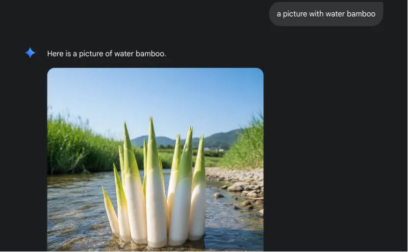 上文提到的神秘茭笋和神奇H₂O分子,由于过于幽默,舆论扩散后已经被连夜撤下。但我还是不死心,茭笋这么神奇的新物种是怎么制造出来的?在我打算用Gemini复现一下这张AI图时,突然想起来,茭白是中国的本土物种,国外不常见,而茭白的英文翻译是:water bamboo。于是我让G老师帮我生成一张water bamboo的图片,一下子,我顿悟了,甚至感觉自己找到了山姆最爱的那条河。