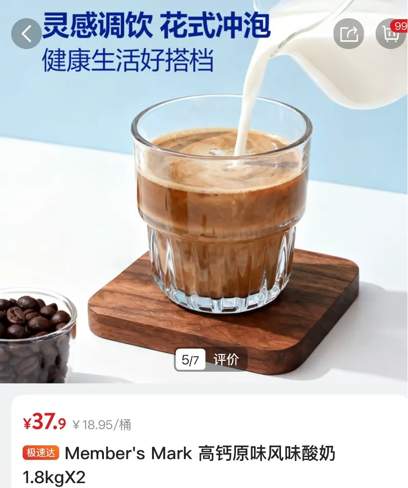 幽默的还有山姆高钙原味风味酸奶,配图是往咖啡浓缩液里倒酸奶,边上还贴心地放好一碗咖啡豆,生怕我认不出那杯褐色液体是咖啡。图上有两行粗细不一的蓝字,宣称这是“灵感调饮花式冲泡健康生活好搭档”,试图用足够大大大大大的字号完成对我的洗脑工作。