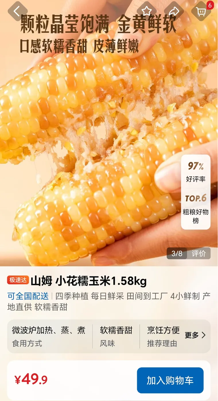 例如这张我截取于11月7日18:40分的山姆小花糯玉米商品图。尽管图中的手和玉米都很逼真,但中间的不明黏状拉丝物实在不知道该怎么出现在真实世界,也许是摄影师用筋膜枪把下方那根玉米打吐了。