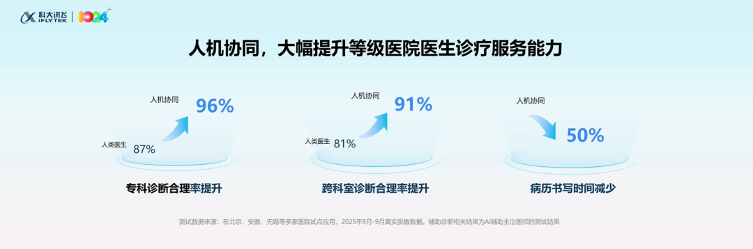 在AI的加持下,人机协同已大幅提升医生诊疗服务能力,其中专科诊断合理率提升至96%,跨科室诊断提升至91%,病例书写时间减少一半。