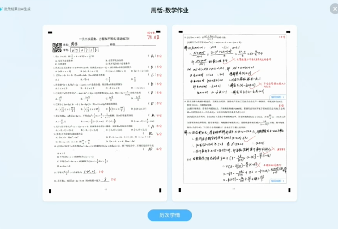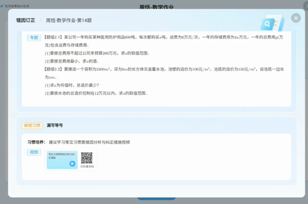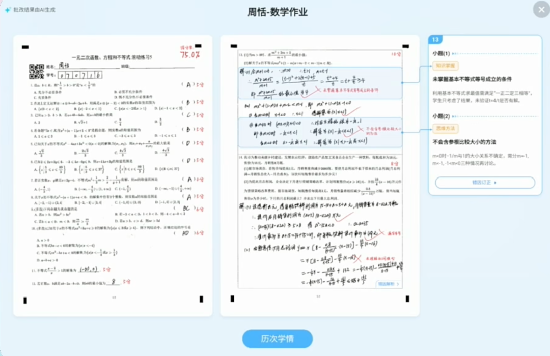 以第一位同学周恬(化名)的数学作业为例,在解答题部分,AI可以「分步骤批改」,并给出了错因诊断,以及纠正方案。