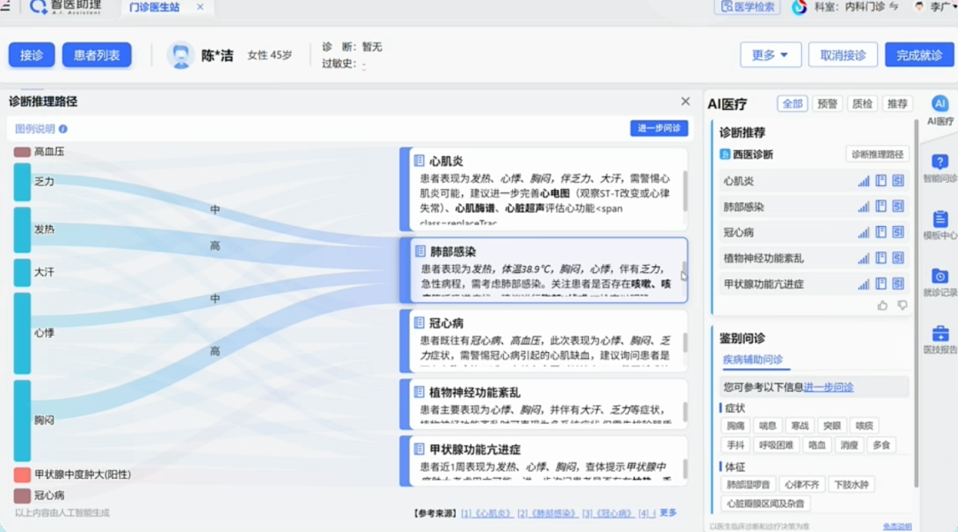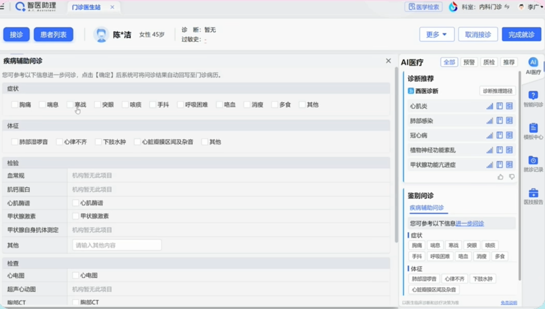 假设调用一份真实的病历——引发热、心悸胸闷,就诊于内科45岁女性患者。