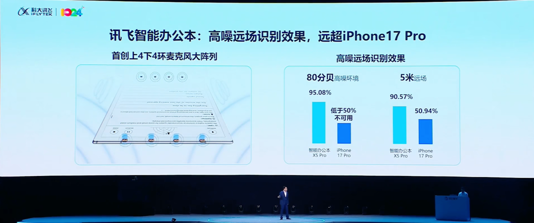 在应用这项技术的讯飞智能办公本X5上,高噪远场识别效果,远超iPhone17 Pro。