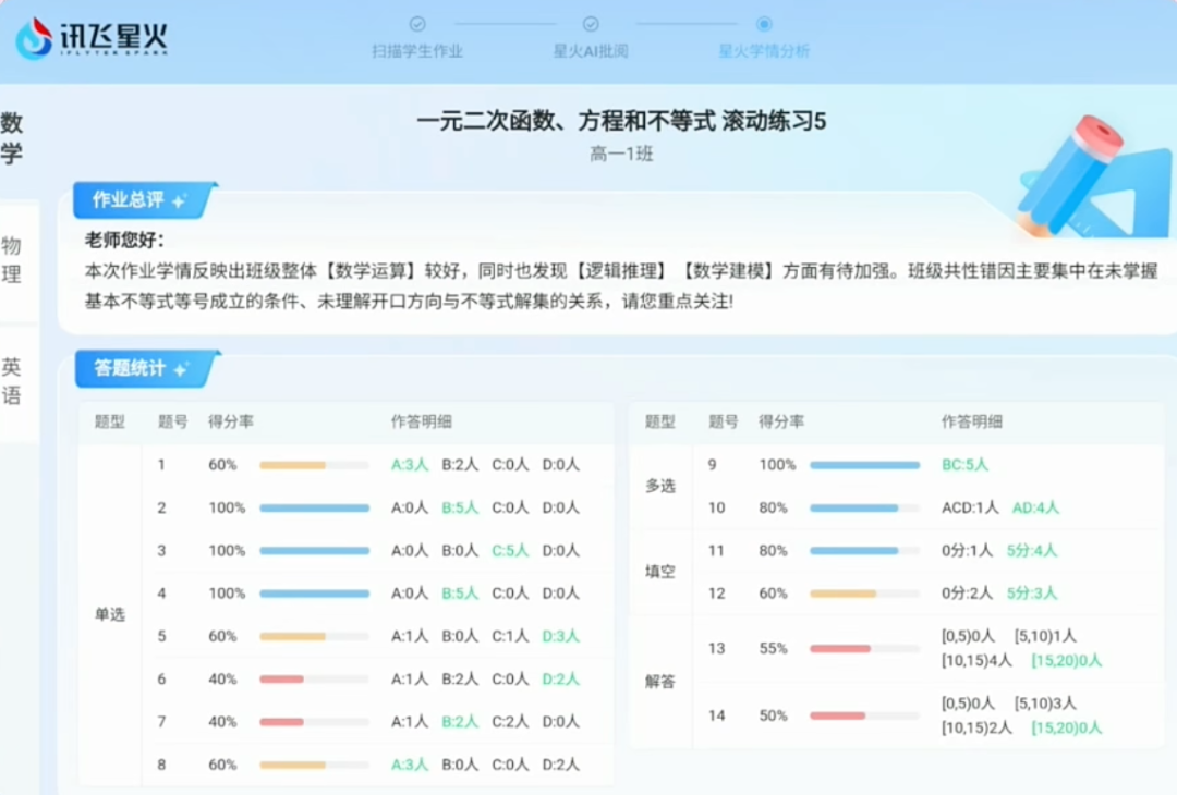 以上只是一个学生的学情,放大到整个班级,批阅机还会为老师生成一份整体的报告。