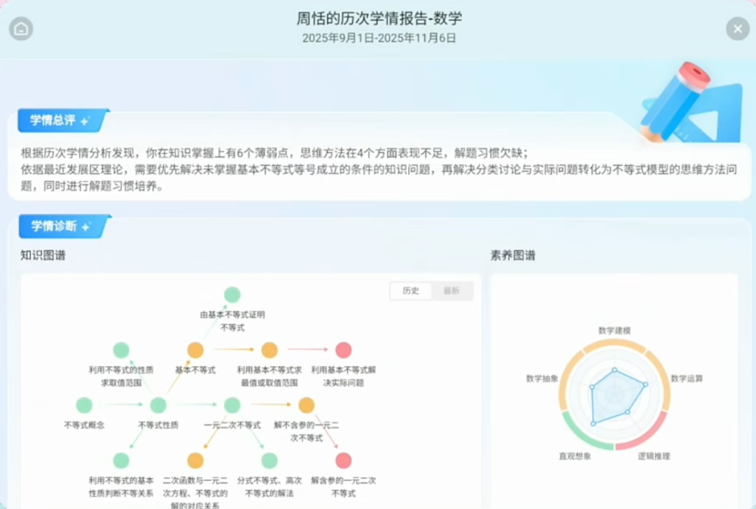 与此同时,随着学情不断累积,它还能直出历次的「学情报告」。
