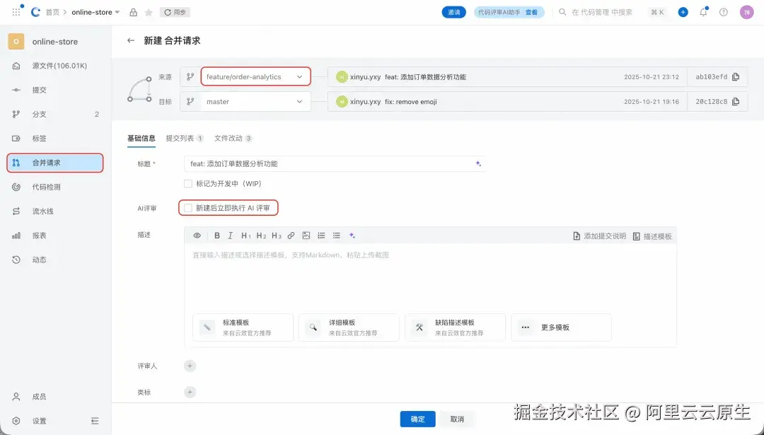 2️⃣ 根据指引,在线创建合并请求(MR/PR)。全程只需点几下鼠标,即可触发 AI 评审!