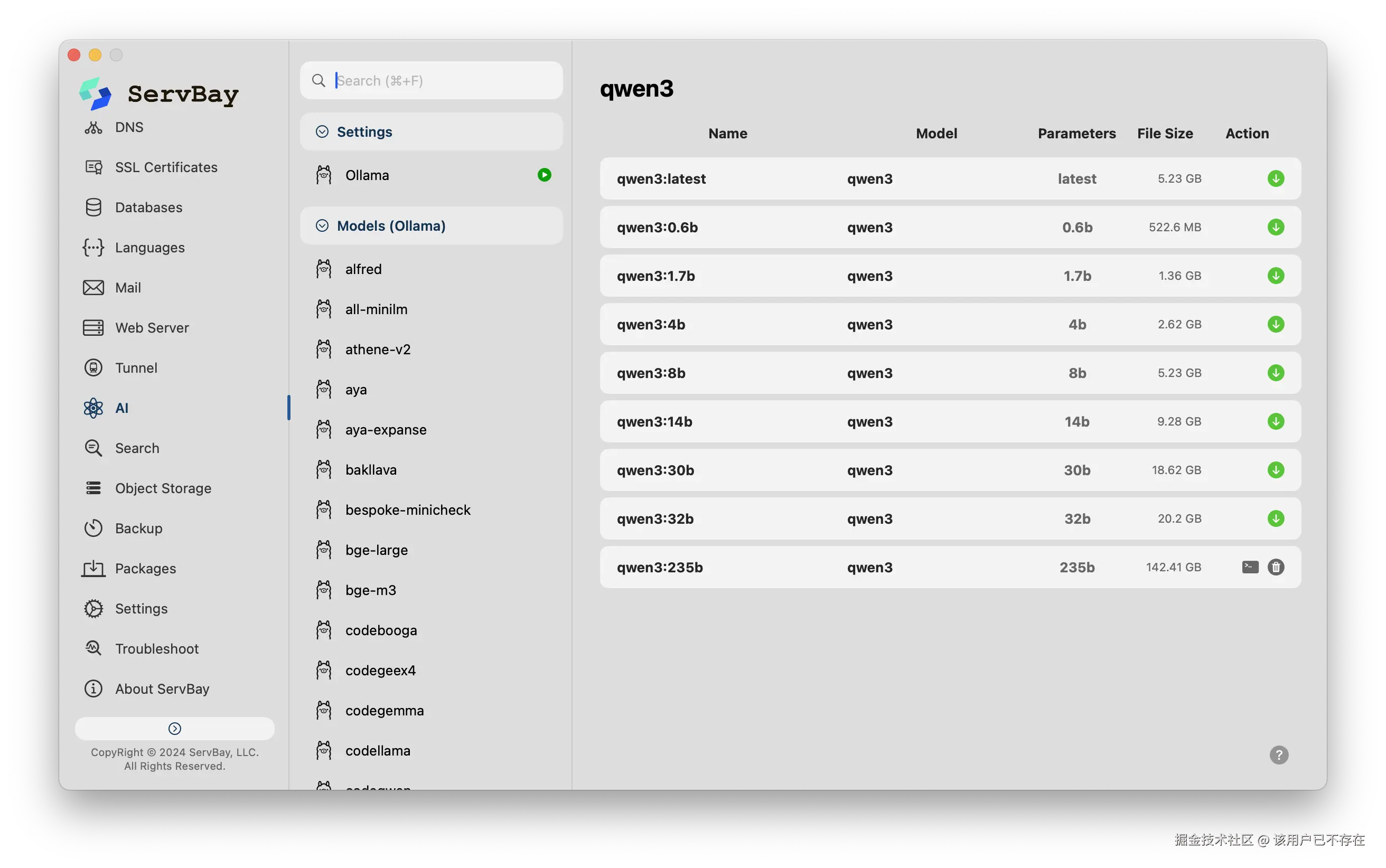 - ServBay:ServBay可是个大宝贝,它本身是一个超级强大的本地开发环境集成工具,能一键管理PHP、Node.js、Python、Rust等多种语言环境,而对于Vibe Coder 来说,它还集成了一键式本地AI部署,它把流行的模型运行框架无缝内置了进去,只需要点几下鼠标,就能在自己电脑上把Llama 3、Qwen这些顶级开源模型跑起来。下载、管理、运行等等,ServBay 都能管理。代码不出电脑,断网也能用,还没有token费用,安全感和自由度直接拉满。