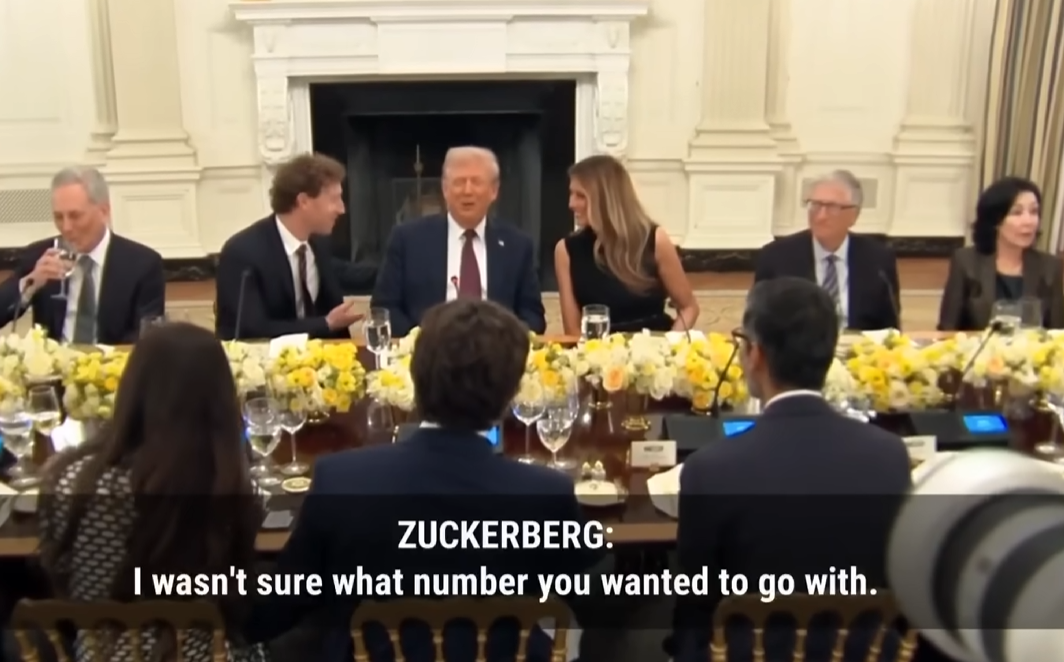 今年9月,美国总统特朗普在白宫设宴招待美国科技领袖,比尔·盖茨、蒂姆·库克、桑达尔·皮查伊、奥尔特曼、纳德拉等科技大佬出席,扎克伯格更是直接坐在特朗普身边。