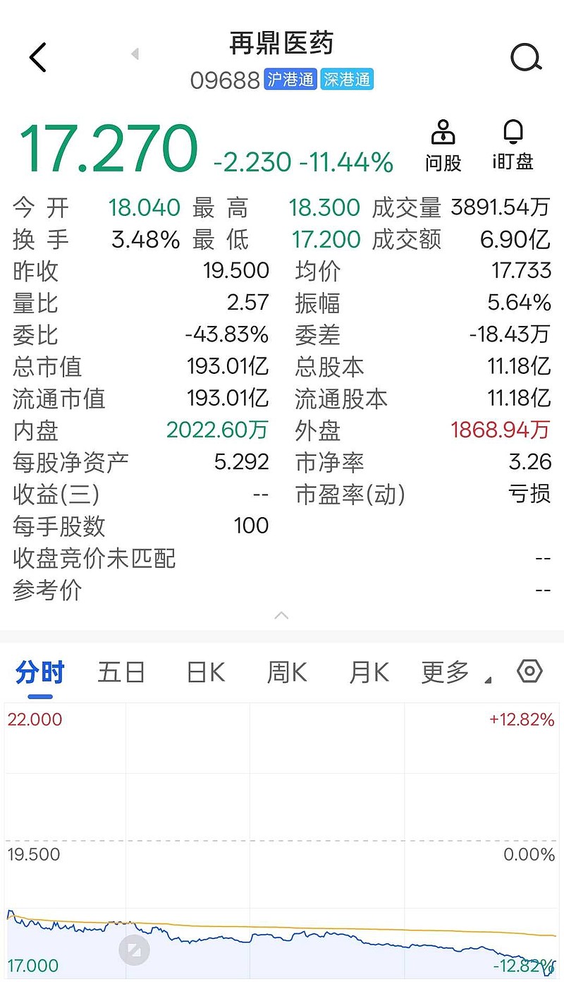 $再鼎医药(09688)$ Q3财报发布,一部分投资者用脚投票,美股先跌,港股开盘大跌超7个点,后跌幅扩大,收盘价17.27。换手率3.48%,成交额6.9亿,天量成交。