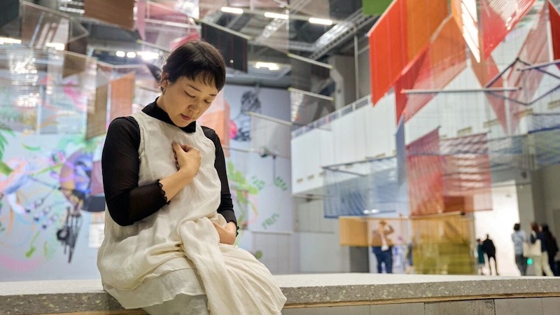 开幕当晚,日本艺术家山崎阿弥在现场做了一场声音表演,她选择了铺满黄花的博物馆中庭,开始歌唱,然后聆听环境的回应。她相信,每一个地方原本就在歌唱,“我用自己的声音唤醒这些地方,照亮回声的阴影;我跟随自己的耳朵行走,它们就是我的指南针。”
