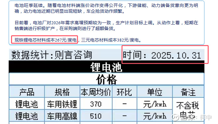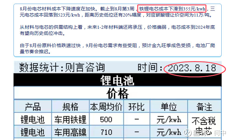 而2023年8月份的时候,当时碳酸锂价格20-21w的时候,铁锂电芯成本在355元。和我们刚才计算的399元还要低。