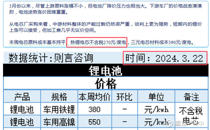 我也去查询了一下2024年3月份,碳酸锂均价在11w的时候,铁锂的不含税成本是在270元。