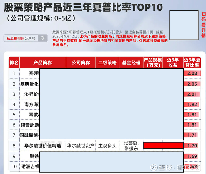 【振东投资】主理的【华尔融世价值精选】以三年期1.7的夏普,入选私募排排网9月发布的小规模股票策略夏普TOP10。具体数据可以私信我 或者 排排网查看。