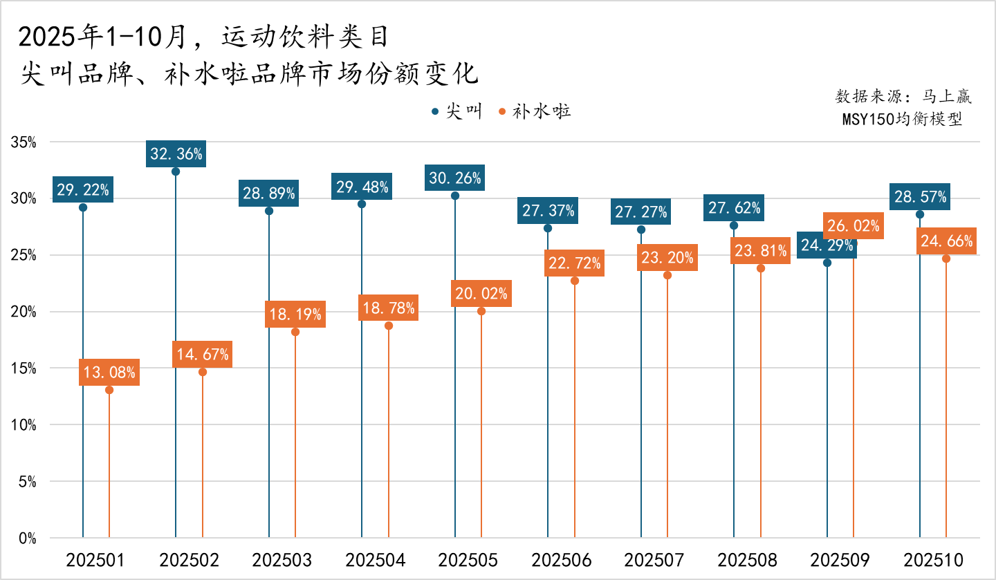 根据马上赢数据显示,补水啦在运动饮料类目中的市场份额从年初的13.06%,一路增长至9月的26.02%,并一度超越了农夫山泉尖叫系列24.29%的市场份额。不过这种增长在10月出现了小幅回调,降至24.66%,低于尖叫系列28.57%的市场份额。