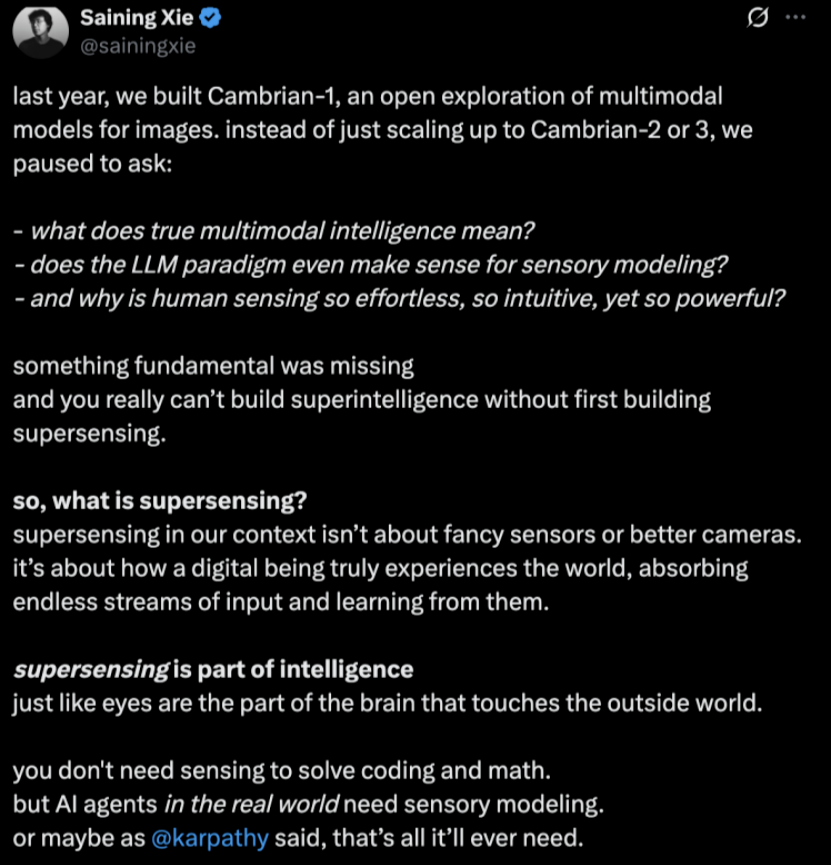 你无法在构建超级感知(supersensing)之前就构建出超级智能。”这无关于更好的传感器或更高清的摄像头,而在于一个数字存在如何真正体验世界,如何吸收无尽的输入流并从中学习。正如 Andrej Karpathy 所说,对于现实世界中的 AI 智能体,感知建模可能就是它所需要的一切。