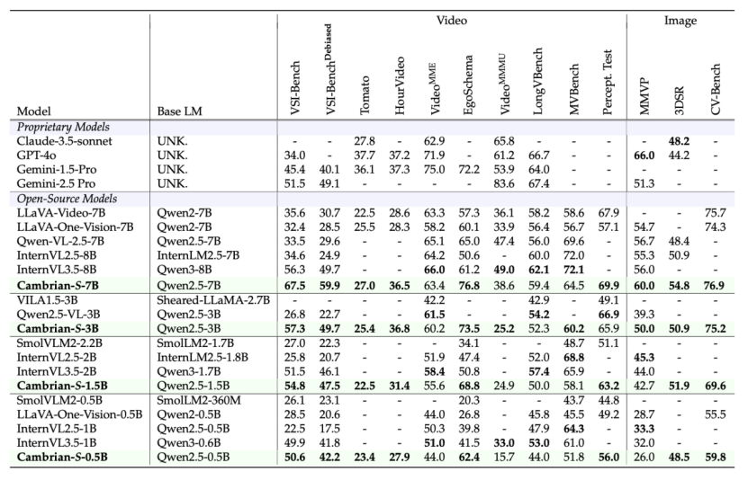 🏆 **Cambrian-S模型及实验验证:** 基于新范式和数据集,团队开发了Cambrian-S模型家族。Cambrian-S-7B在VSI-Bench上取得了显著领先的准确率,并且通过集成预测性感知机制,在长视频理解任务中表现出比商业模型更稳定的性能和更低的资源消耗,验证了该机制在提升模型长视频理解能力方面的有效性。