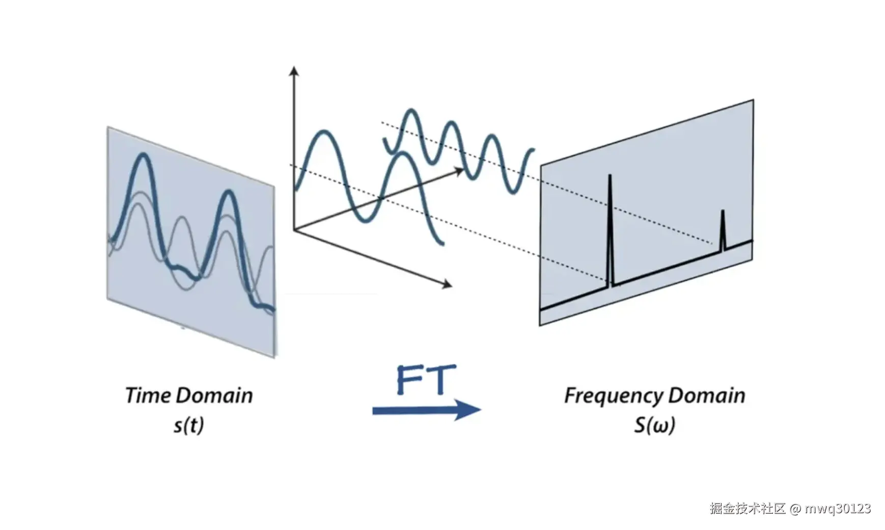 傅里叶变换的核心思想是:任何时域信号 f(t) 都可以分解为不同频率 (ω) 的 sin 和 cos 波的叠加。