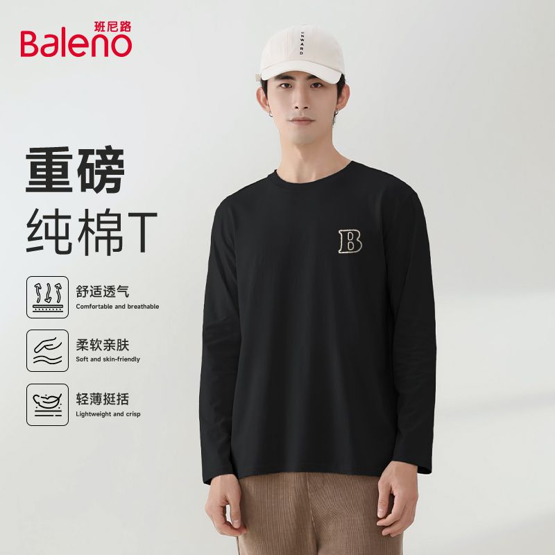 拼多多正在进行百亿补贴活动,Baleno班尼路的这款25年秋季男士黑色纯棉长袖T恤不要错过!它是宽松休闲的打底衫,圆领设计,上面还有印花,时尚又舒适。