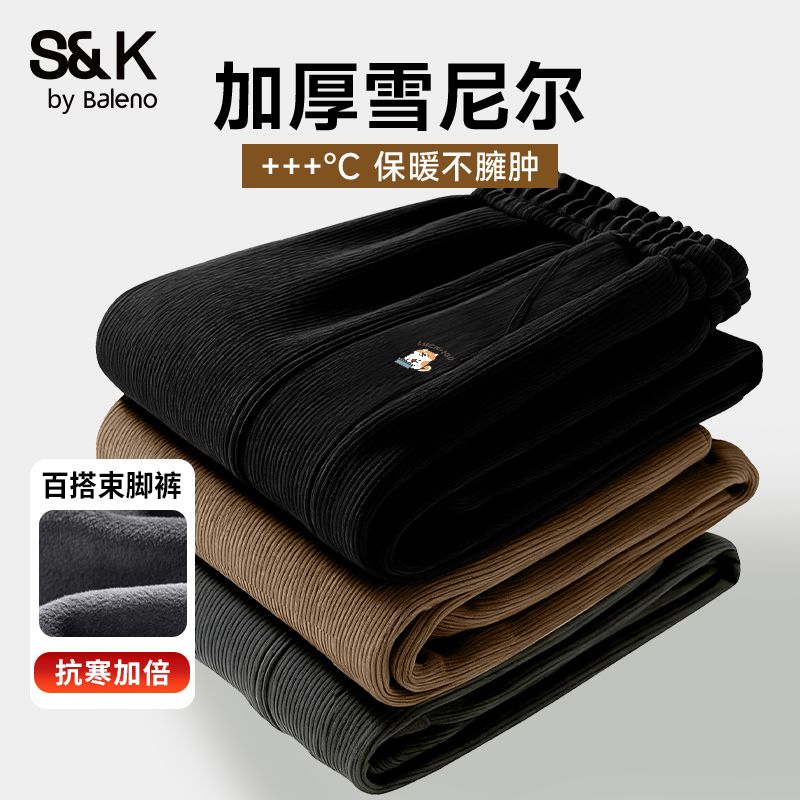 Baleno班尼路S&K系列雪尼尔加绒休闲裤专为男士打造,冬季保暖抗寒必备单品,采用加厚雪尼尔面料搭配内里细腻加绒,锁温舒适不惧寒冷,立体剪裁结合束脚设计,兼顾时尚感与活动自如,无论是日常通勤还是户外运动都能轻松驾驭,质感出众耐穿耐磨。