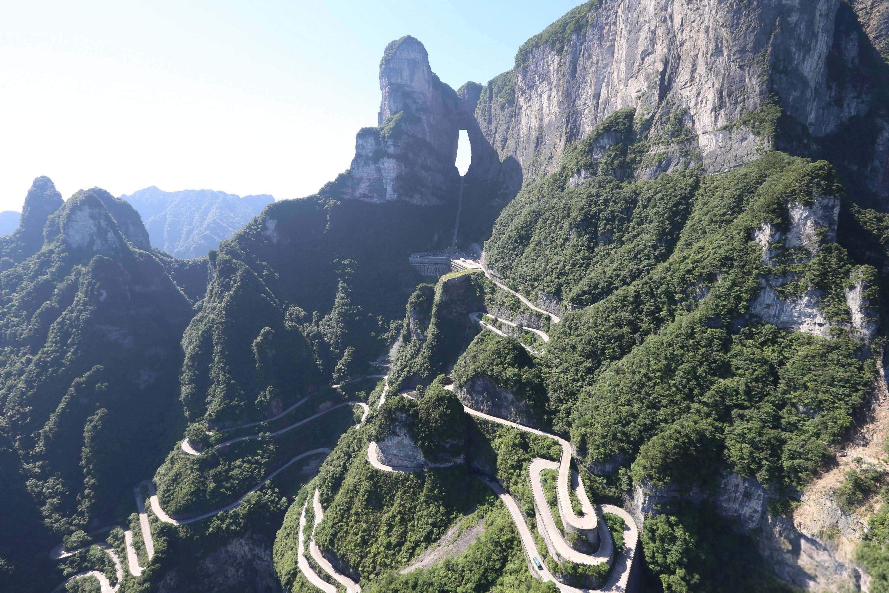 天门山这条99道弯的公路,全长10.77公里,像蛋糕一样一层层叠起来,形成了1100米的垂直落差,赛道的最大坡度达到14度,看起来非常壮观和震撼。