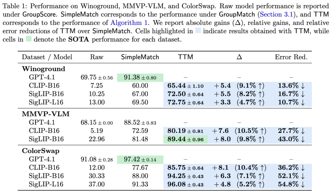 值得注意的是,TTM让SigLIP-L16在ColorSwap数据集上提升至GPT-4.1的水平,并使SigLIP-B16(仅0.2B参数)在MMVP-VLM上超越GPT-4.1,刷新了当前最优结果。