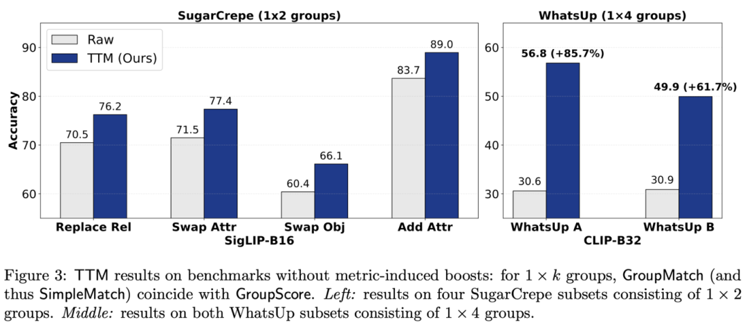 即便如此,TTM在SugarCrepe和WhatsUp等数据集上依然带来了显著提升,其中在WhatsUp上的相对增幅高达85.7%,让原本困难的任务变得可解。