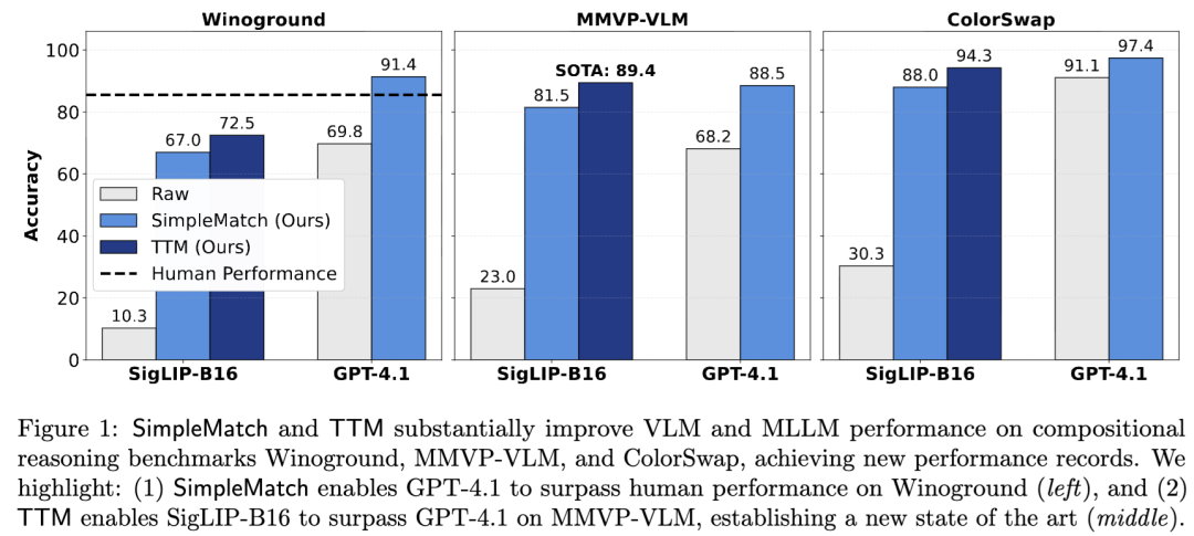 如上图所示,SimpleMatch揭示了模型中大量「被隐藏」的潜力——它让仅有0.2B参数的SigLIP-B16超越了此前所有结果,并使GPT-4.1首次在Winoground上超过人类表现。