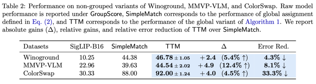 即使将Winoground、MMVP-VLM和ColorSwap等数据集全部「打平」为无群组结构,TTM依然能显著提升表现,最高可带来33.3%的相对错误率下降。